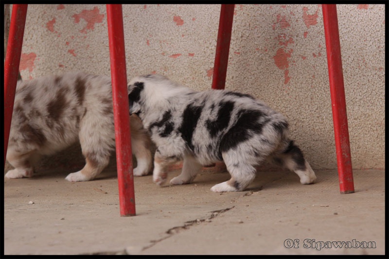 Les bébés grandissent et ont fêté leur sixième semaine mercredi dernier!! Les caractères se dessinent bien mieux maintenant. Ce sont des bébés adorables qui adorent jouer, faire des câlins, galoper, faire les fous dans l'eau, chopper les lacets, les bas de pantalons, bref tout ce qu'aiment faire des bébés de leur âge bien dans leurs patounes!! :D